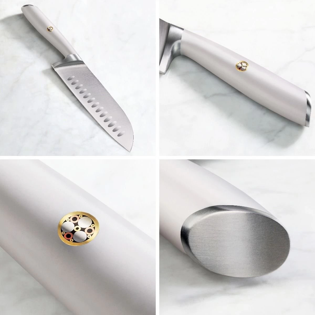 Uncompromising quality combines with cutting edge design in the L1 Series Knife Block Set from Cangshan Cutlery. The full tang blades are forged from tight-grained German Steel for incredible durability and edge-retention. With sleek lines and blunted ends, the handles’ white minimalist aesthetic is accented by a single mosaic-style rivet for a subtle flair of artful sophistication. The patent-pending design focuses on the uniquely tapered tang, which ensures comfortable, precise cutting. This set includes three of the most-used knives for food preparation: a chef’s knife, serrated utility knife and a paring knife. The 3 pieces fit into the luxuriously handcrafted acacia wood block, adding rich warmth to your countertop. For a design that masterfully blends functionality with sophistication, order your Cangshan Cutlery L1 Series Knife Block Set today.