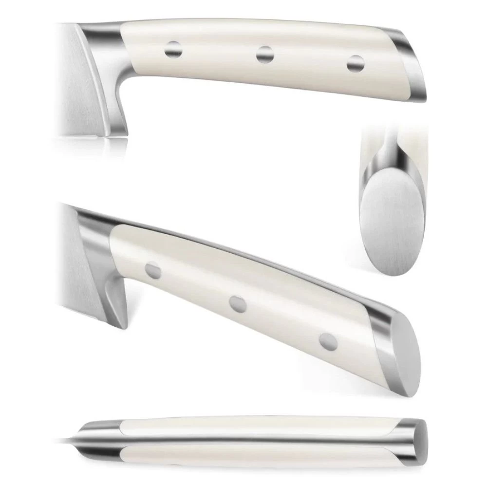 - Ergonomic polymer handle in sleek, minimalist white