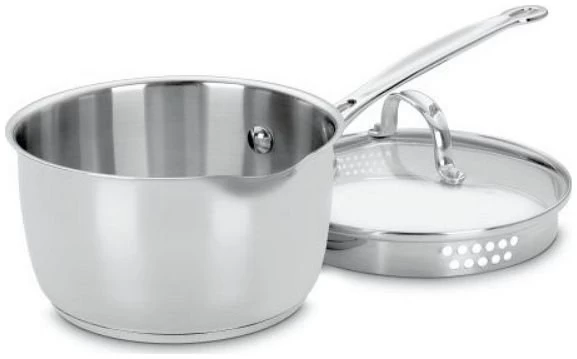 Easily drain vegetables, noodles, and much more with the easy “cook and pour” feature; this Cuisinart Saucepan’s lid doubles as a strainer. Two different sized draining holes allow you maximum control. This stainless Cuisinart Saucepan is dishwasher safe for easy cleaning. This high-quality Stainless Steel Cuisinart Saucepan is backed up by a lifetime warranty.
