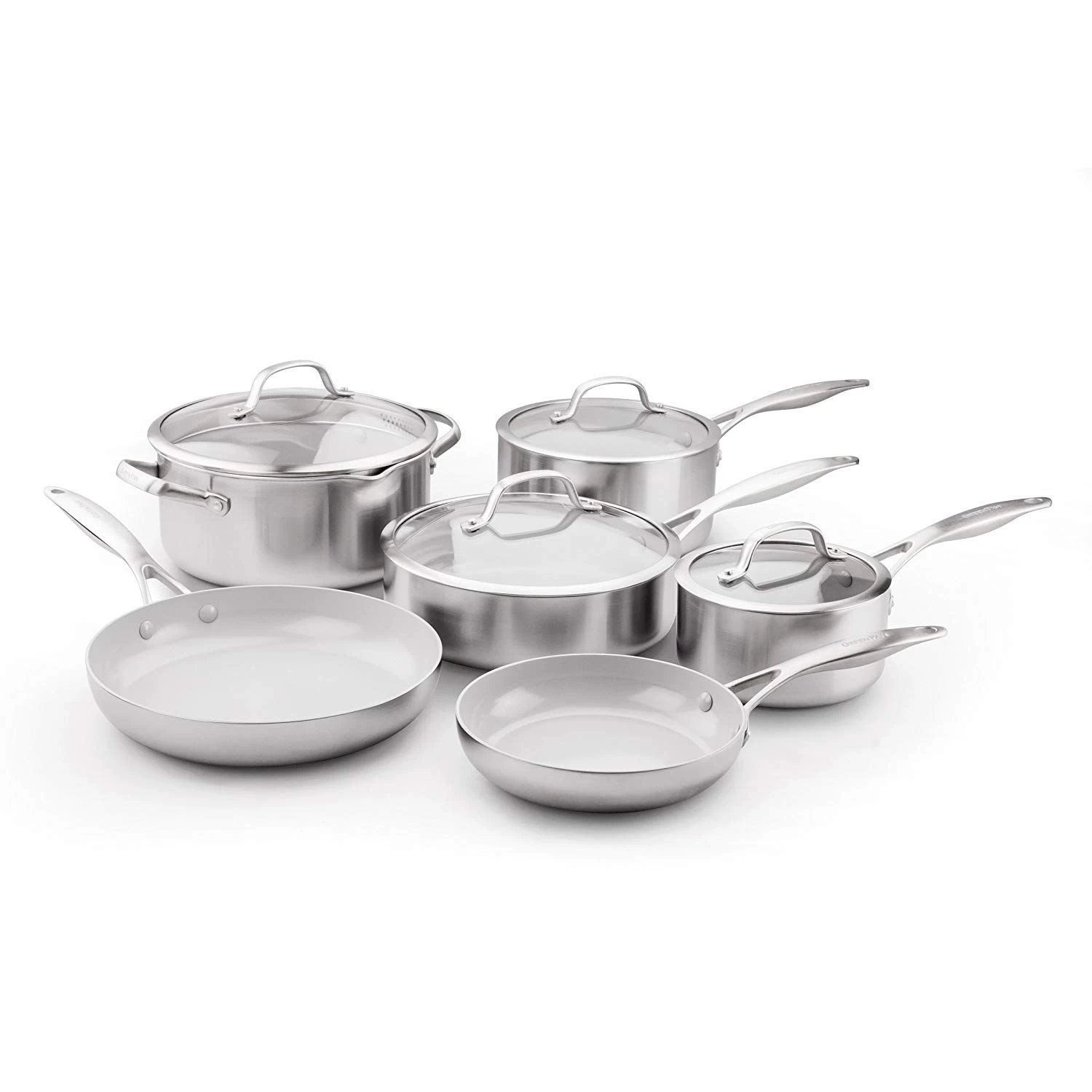 With riveted, ergonomic stainless steel handles for a comfortable grip and easy transport, each piece within this dynamic cookware set is grill-safe, dishwasher-safe, oven-safe up to 600°F, and safe for use with metal utensils, giving you ultimate cooking versatility. For truly stainless steel cookware that’s built to last, try the Venice Pro Evershine™ 10-Piece Cookware Set by GreenPan today!