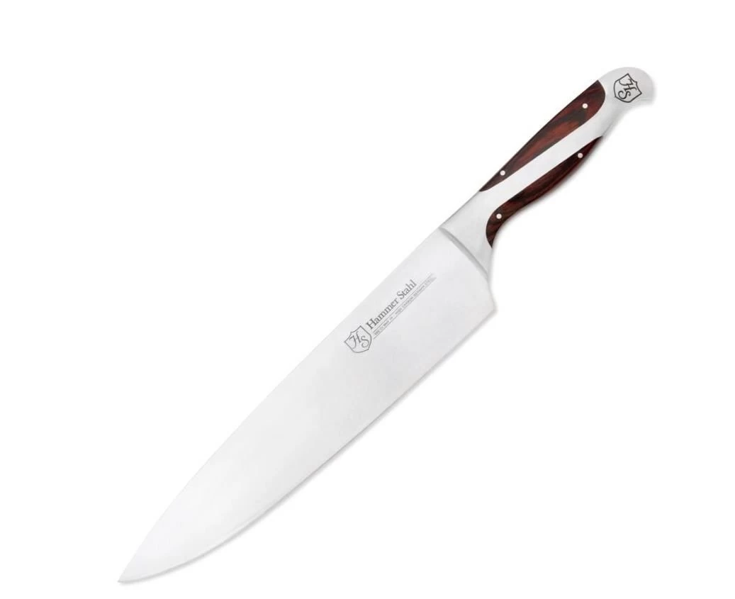 Sharp – a word that can accurately describe both the edge and the appearance of the Hammer Stahl 10â Chefâs Knife. This heavy-duty, all-purpose knife with the graceful lines is as effective as it is attractive. Its laser-measured knife edge is made of high-carbon stainless steel tempered to 55-57 on the Rockwell hardness scale and sharpened to a 28° bevel to retain its razor-edge for years of use. A gently sloping bolster provides a comfortable, secure grip and flows into a stunning Pakkawood handle reinforced with phenolic resin, combining the beauty of wood with the durability of plastic. The large Hammer Stahl 10″ Chefâs knifeâs good looks continue through the quad tang design, which reveals the steel on all sides while providing balance and heft in the hand. Mincing, slicing, dicing, chopping – Hammer Stahl builds enduring versatility into its cutlery so that you can enjoy its beauty and performance in your home for years.