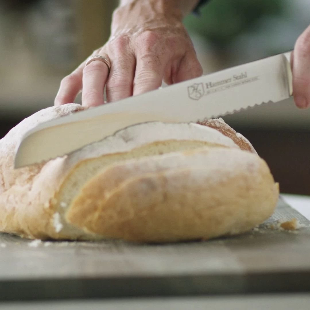 Nothing ruins a delicious, crusty loaf of bread like using the wrong knife to slice it. Save yourself—and your guests—from squished, unappealing bread with Hammer Stahl’s 8” Bread Knife. Like all Hammer Stahl cutlery, this heavy-duty knife is made of durable, high-carbon German stainless steel. It’s tempered to a Rockwell hardness of 55-57 for superior edge and lasting durability. The ultra-sharp blade has a scalloped edge that cuts through bread without crushing, tearing, or leaving crumbs.