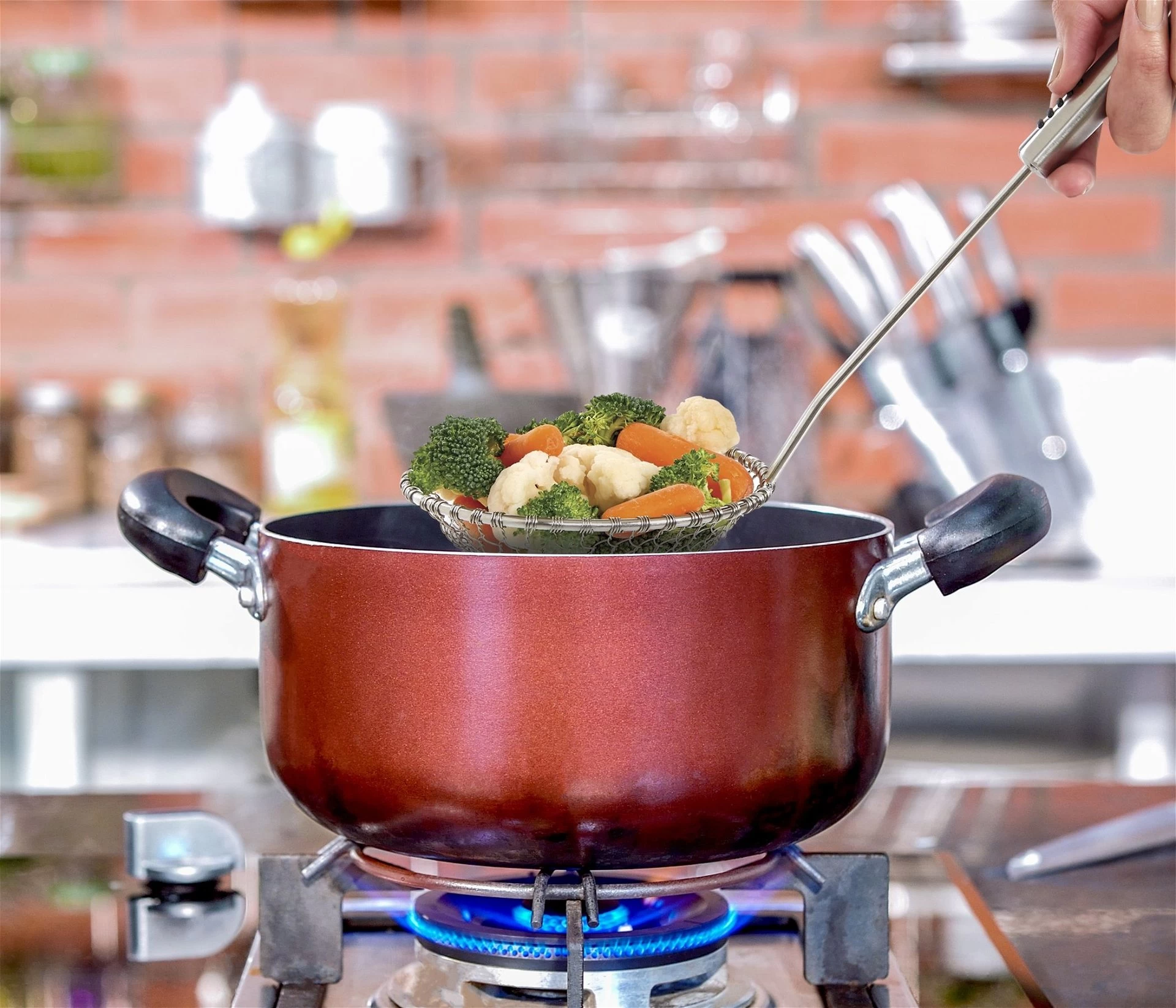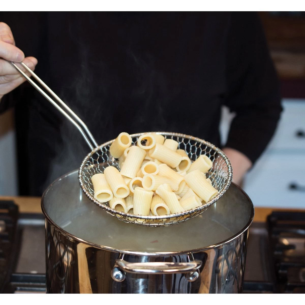- Food sits securely in shallow mesh basket to prevent splashes and mess; use for draining noodles or pasta, blanching vegetables, deep frying, and more
