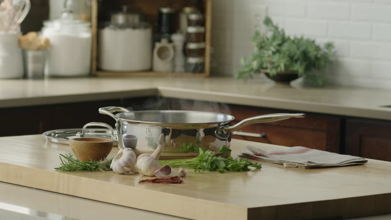 Hammer Stahl’s cookware is made through ingenious 5-ply construction. There are five layers of different metals in each piece of cookware that work together to spread the heat evenly and efficiently. These five layers are not just used for the base of the cookware, but the sides as well. This means the aluminum core will spread heat throughout the walls as well as the base, allowing the heat to spread more evenly and make the cookware less likely to burn.