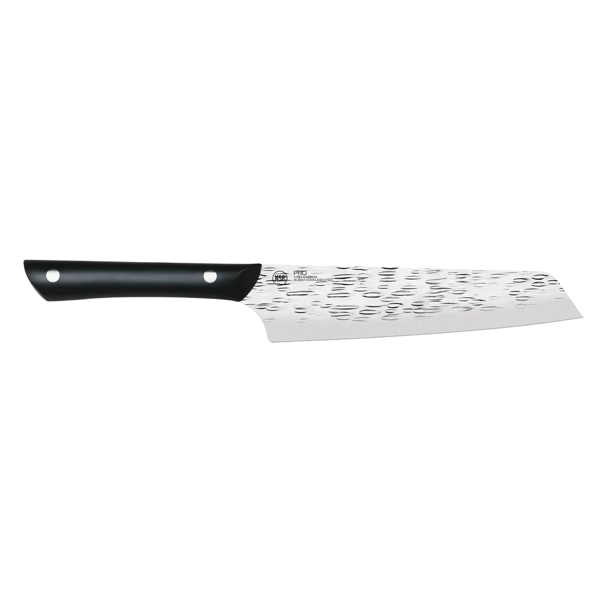 NSF-certified for use in commercial kitchens, Kai PRO knives are made of Japanese AUS6M high-carbon stainless steel and hand sharpened to a 16° edge on each side. Full-tang with a double-riveted handle, the PRO series knives are built to stand up to daily, professional use. The striking hammered blade finish is more than just beautiful; it reduces drag and helps food release from the blade easily. With a limited lifetime warranty, you can count on the precision performance this Kai PRO knife will bring to your prep work.