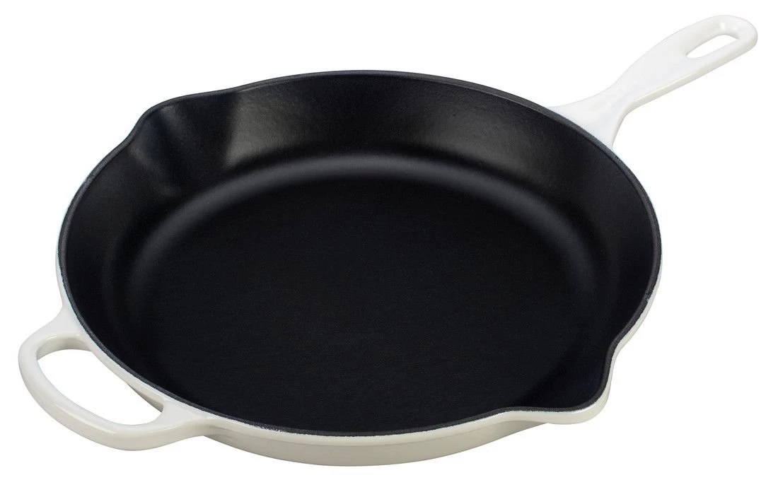 This iron handle provides a solid grip that makes it easy to carry the beautiful piece of cookware straight from the stovetop to a table trivet. Enamel coating on the inside of the skillet develops a natural patina which can enhance the pan’s ability to sear and fry foods. Le Creuset’s White Cast Iron Skillet is a durable piece for home-cooked meals with the family or whipping up gourmet recipes for holidays and special occasions.