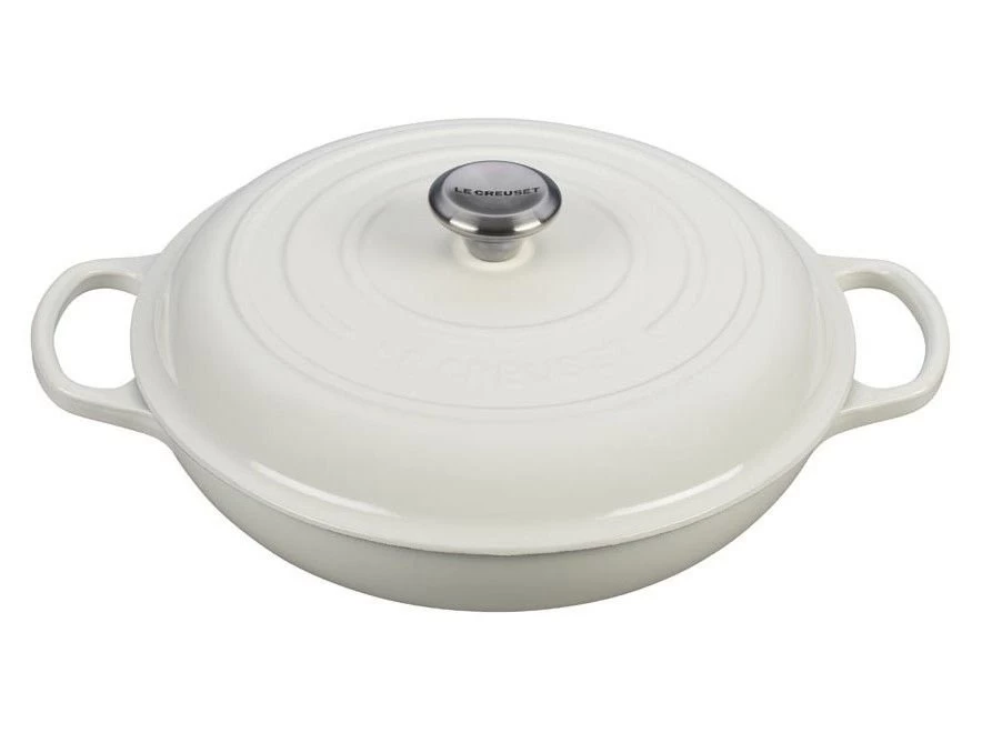Gather the family round the dinner table for a hearty meal braised and browned in Le Creusetâs 3.5 Quart Cast Iron Braiser in white. Easily prepare your family dinner with a cast iron braiser that distributes heat evenly and efficiently so you donât have to worry about hot spots while you cook.