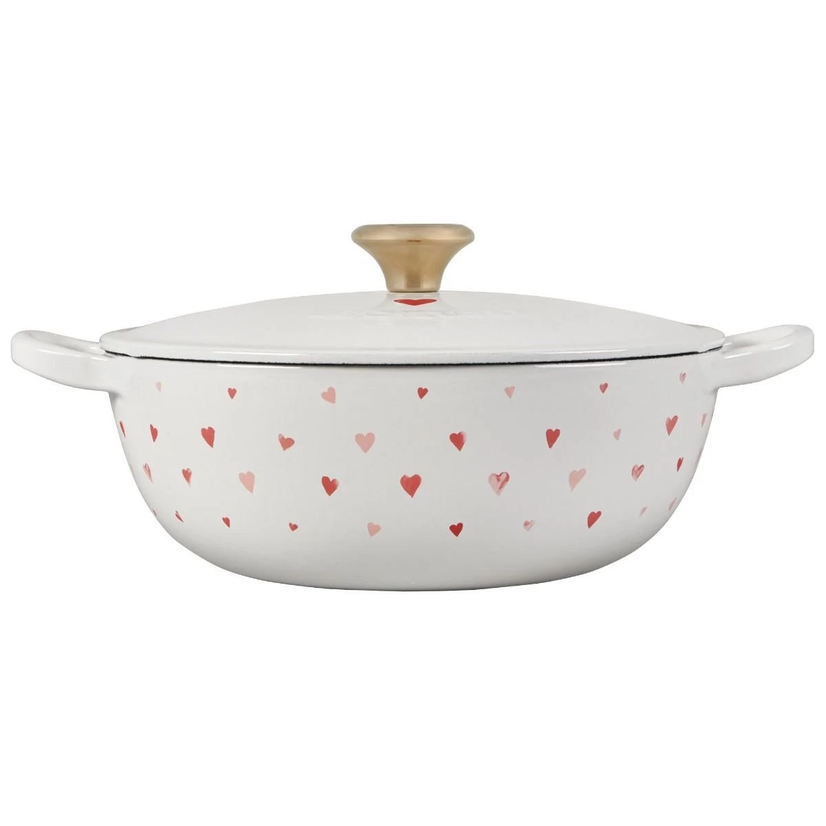 Le Creuset L’Amour 2.75 Qt. Enameled Cast Iron Soup Pot with Gold Knob & Heart Applique (White) Features: