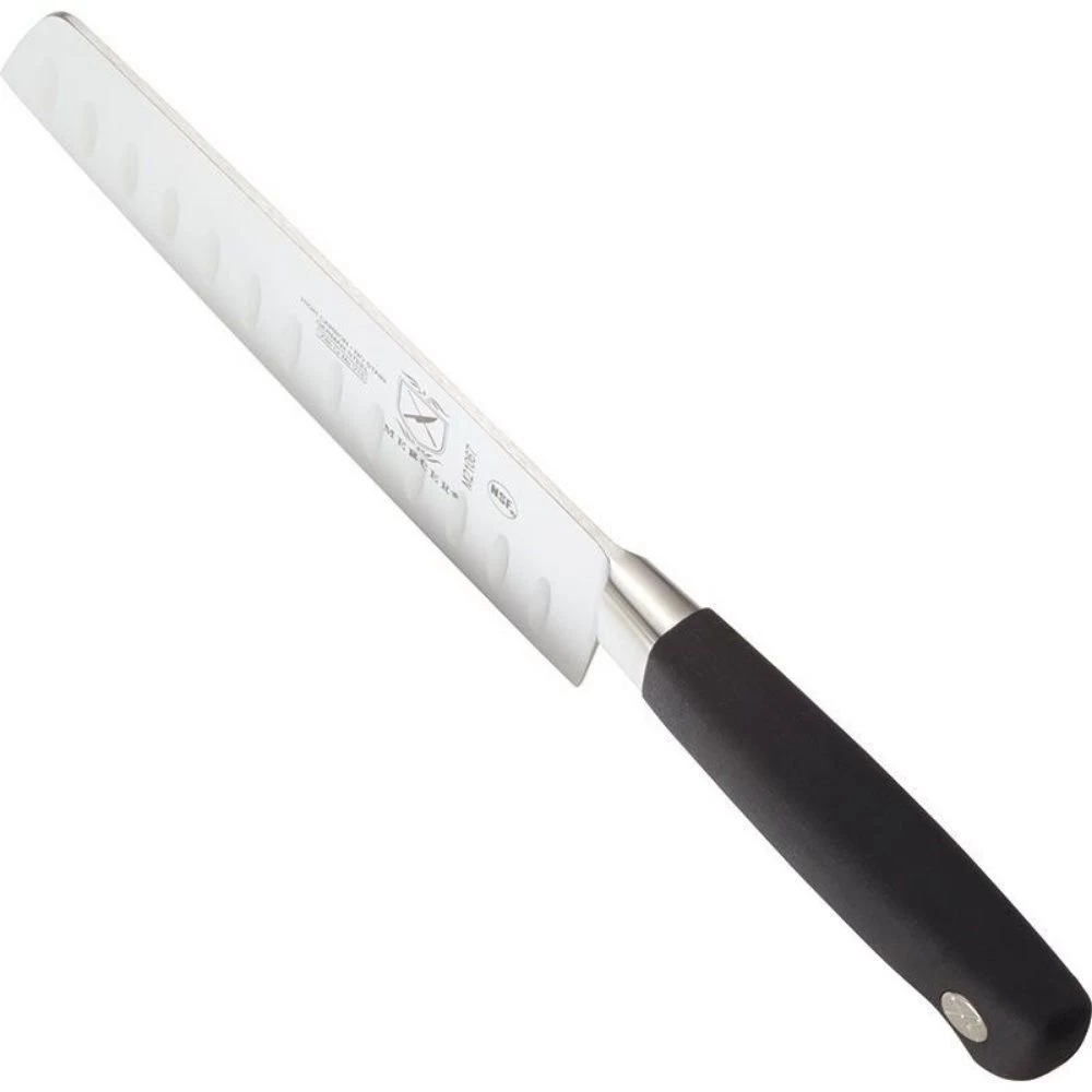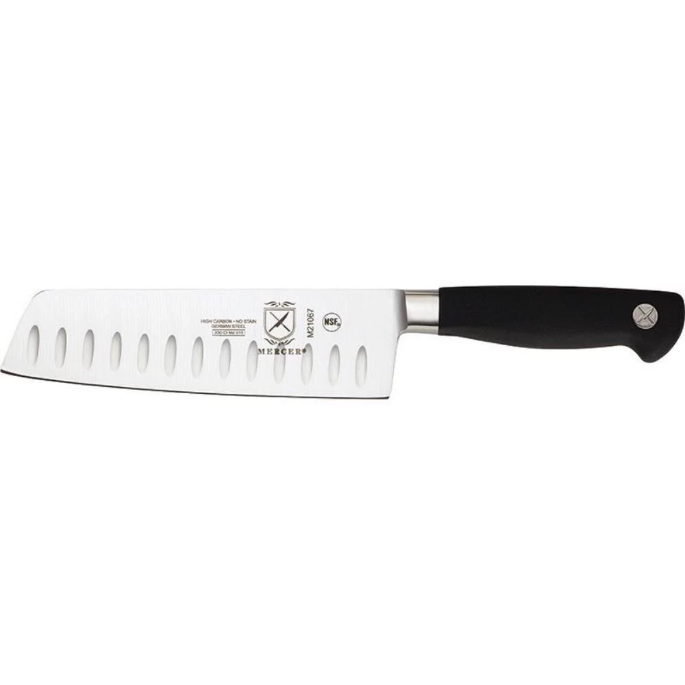 If you prep a lot of vegetables, you need to add the Mercer Genesis 7” Granton Edge Nakiri knife to your kitchen. This Japanese-style knife features a slightly curved blade and a thick body, perfect for slicing through even the toughest of vegetables. The Granton edge serves to create airflow while cutting so that food doesn’t stick to the blade, making it more efficient. As a part of the Genesis collection, this Nakiri knife is precision forged from high-carbon stainless steel. This construction ensures that it will resist rising, corrosion, and discoloration. The Nakiri is designed with a bolster and tang, so it’s perfectly balanced and easy for anyone to use. Get the 7″ Granton Edge Mercer Genesis Nakiri today and prepare to efficiently slice your veggies for years to come!