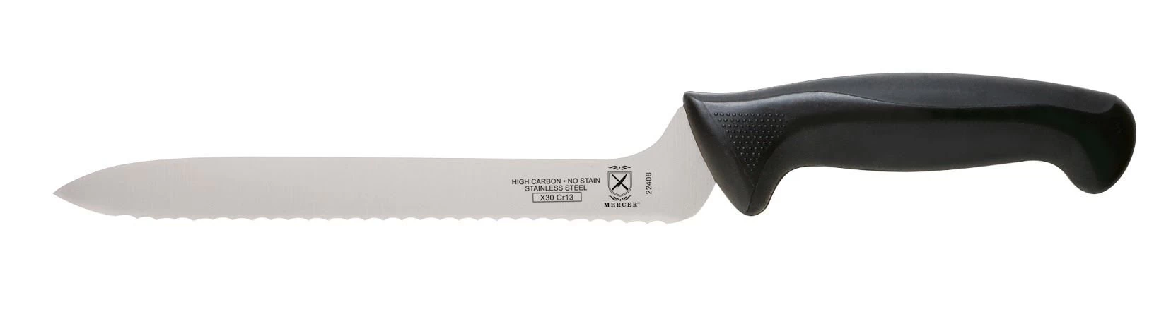 Evenly slice fresh baked breads with Mercer’s Millennia™ 8″ Commercial Bread Knife with an Offset Blade and Wavy Edge. The ergonomic handle is designed with Santoprene for comfort and polypropylene for durability. Millenia blades are designed with one piece of high carbon stainless steel, razor-sharp edges, and textured fingers for an innovative design to meet the demands of today’s professional chefs. Mercer’s Millenia™ 8″ Commercial Bread Knife includes an offset blade that allows it to cut straight down to the cutting board, leaving no crust behind!