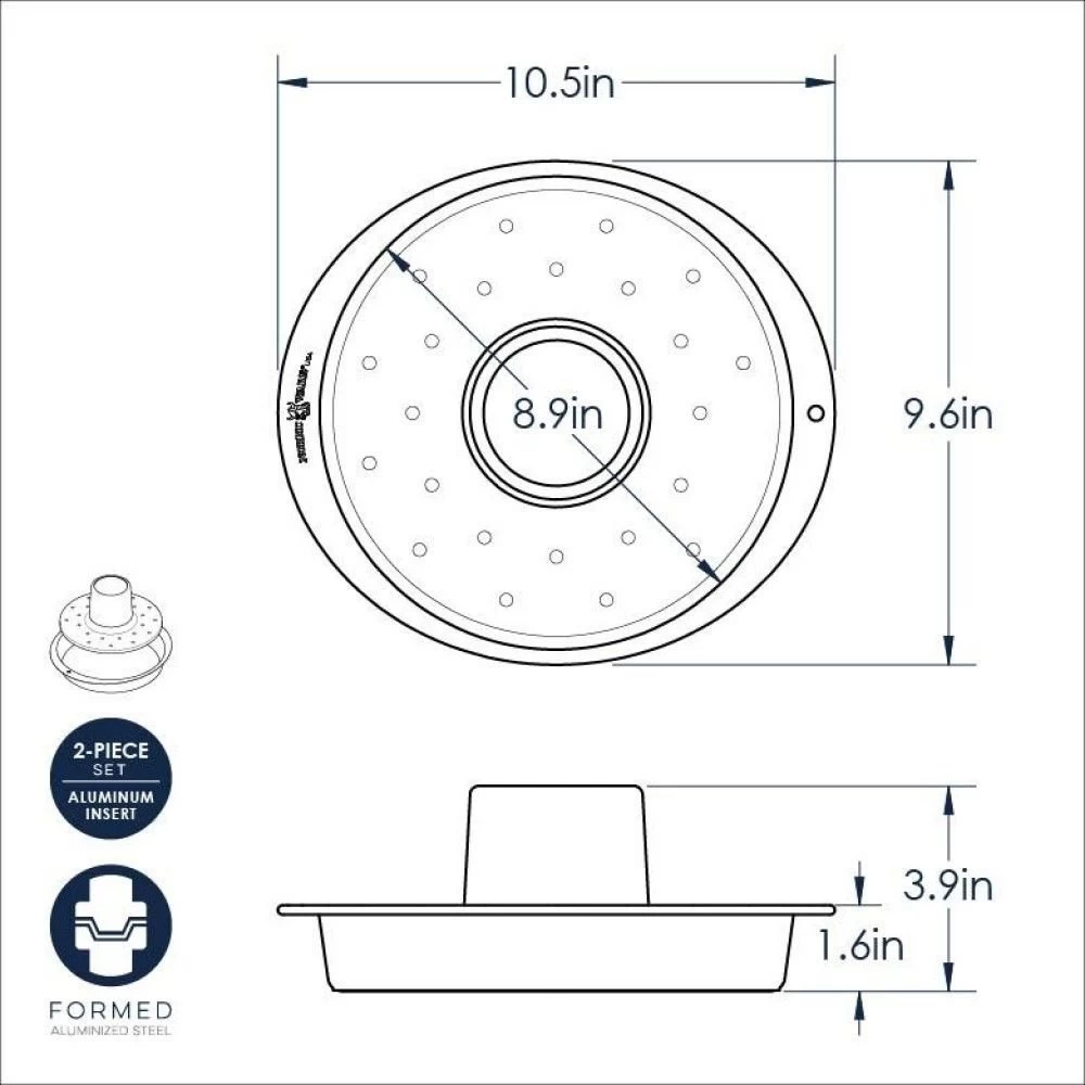 Cook an iconic, flavorful beer can chicken on the grill or in your oven with this two-piece pan. The cooking cone is sized to fit over a can of your favorite beverage on the grill; this offers a more appetizing approach to infusing flavor such as beer, wine, juice, etc. into your chicken as it cooks. Features a spun aluminum cone and aluminized steel base, both coated in a nonstick for ease of clean-up. Made in USA.