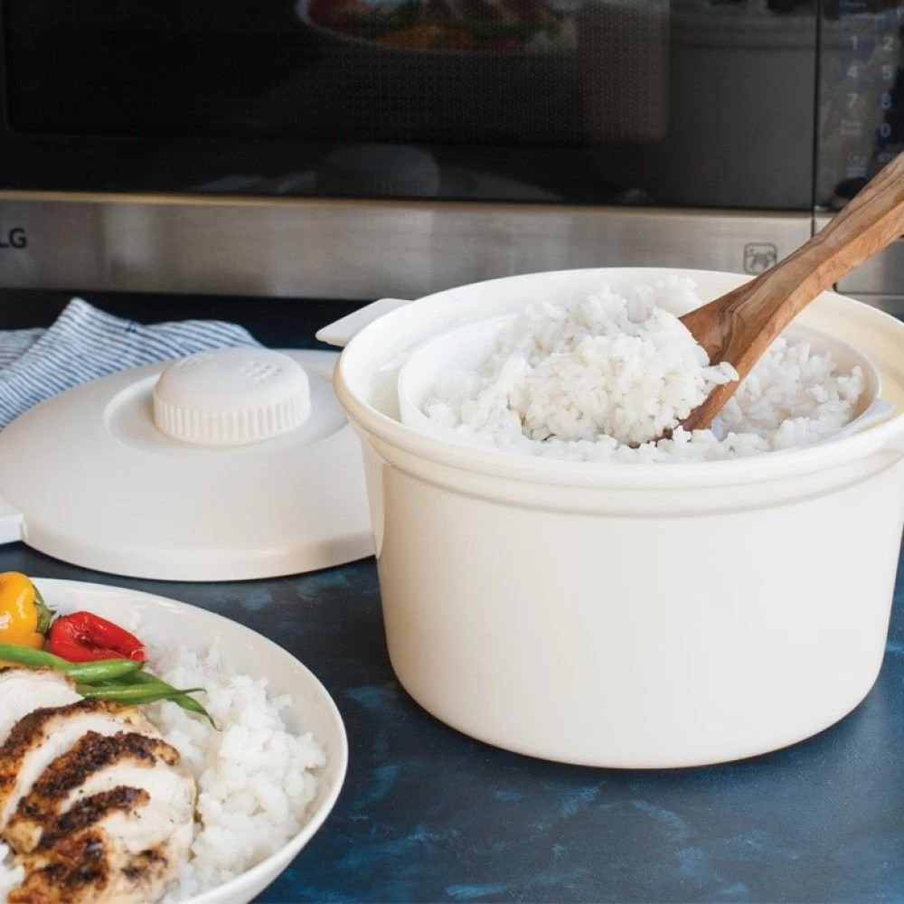 This 8-cup capacity microwave rice cooker is fast and simple. Cooks rice in minutes and is also ideal for steaming vegetables and pasta. Made from BPA-free and melamine-free plastic.