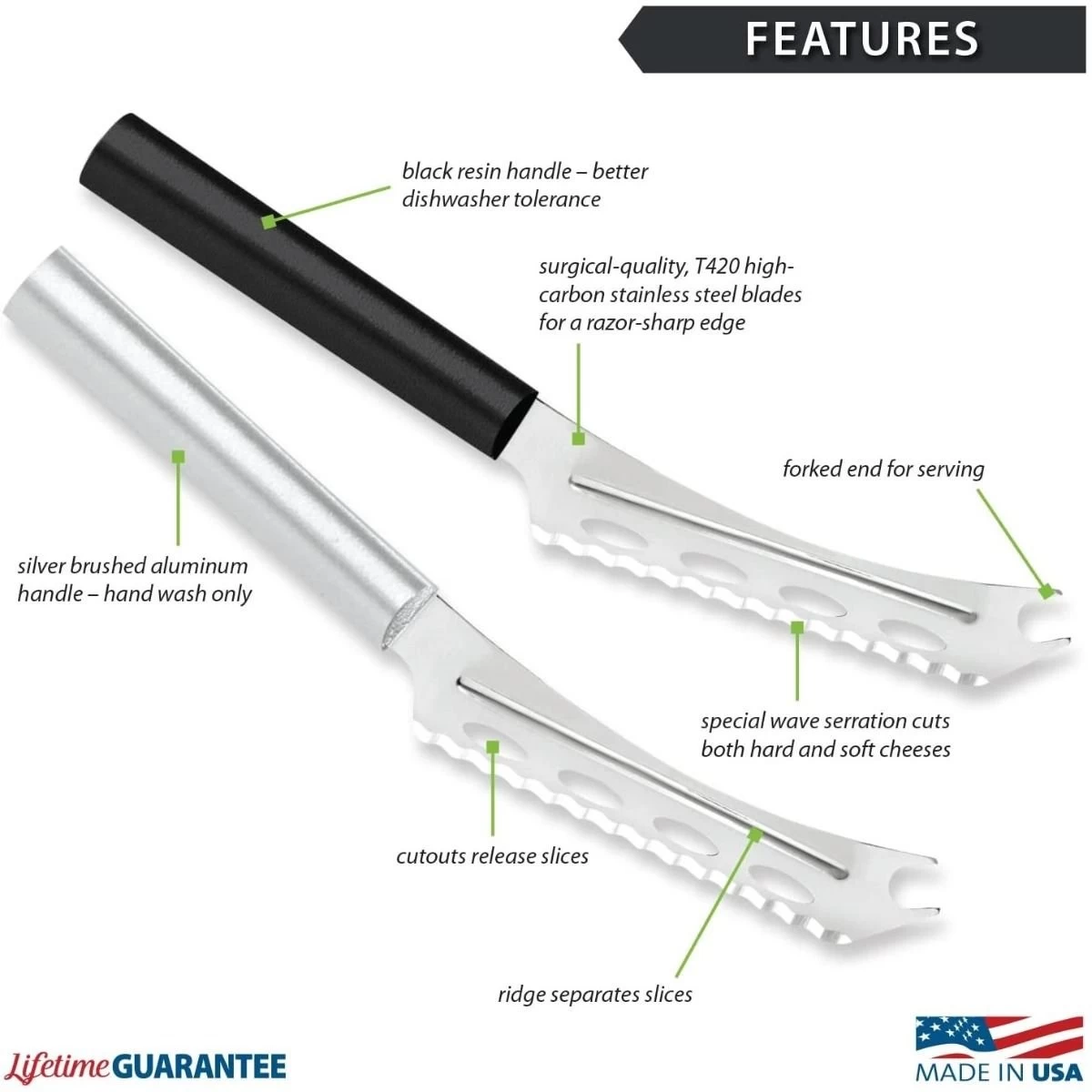Not all cheese knives are created equal! The Rada Cheese Knife is a unique and innovative tool that easily cuts through—and helps serve—any type of cheese. The superior quality of Rada’s Cheese Knife makes it an ideal tool for your kitchen, party table, or meat & cheese tray. Its 5.25″ blade easily cuts through all kinds of cheese—soft or hard—thanks to our specially serrated edge. The cutouts in the blade provide effortless slicing, and the unique ridge separates slices as you cut. The sharp forked end is just another in a long line of remarkable features that assures over-the-top usefulness. Use it to slice salami and summer sausage too!
