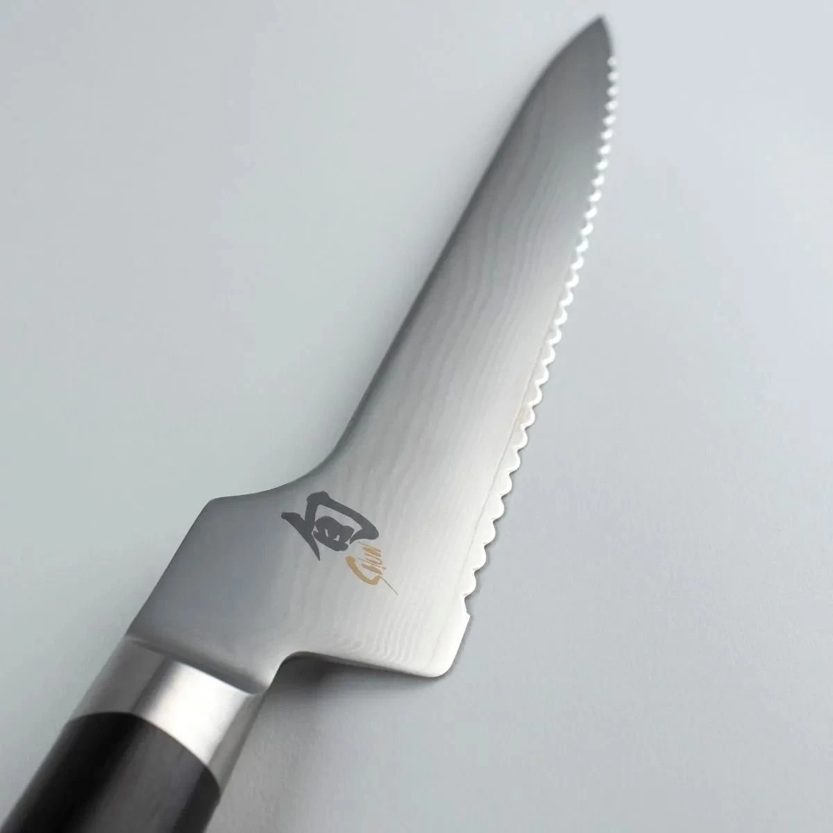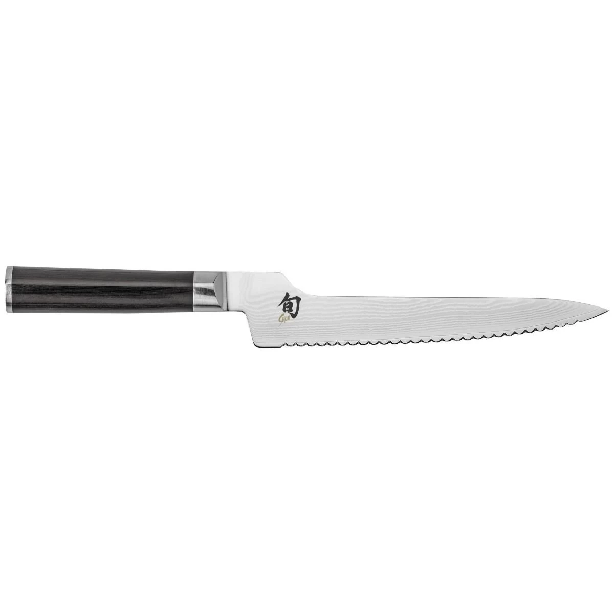 Allow yourself the right to wield some of the best Japanese knives with the Shun Classic Series! This 8.25″ Offset Bread Knife will be perfect for slicing fruit, tender pieces of meat, and sandwiches due to its width, especially with the unique design and blade serrations. The blade is made from 34 layers of stainless Damascus cladding on each side, so the proprietary VG-MAX cutting core sufficiently resists corrosion and wear over time while each razor-sharp 16° edge promotes true precision. A D-shaped ebony-finished Pakkawood handle accompanies each blade with a full composite tang for balance and lightness, meaning these blades may be used for left & right-handed users. For a variety of kitchen tasks from preparing meat, veggies, bread, sandwiches, and more, this blade will grant finesse and maneuverability. Now equip yourselves with the best Japanese-made knives—order the Shun Classic 8.25″ Offset Bread Knife!