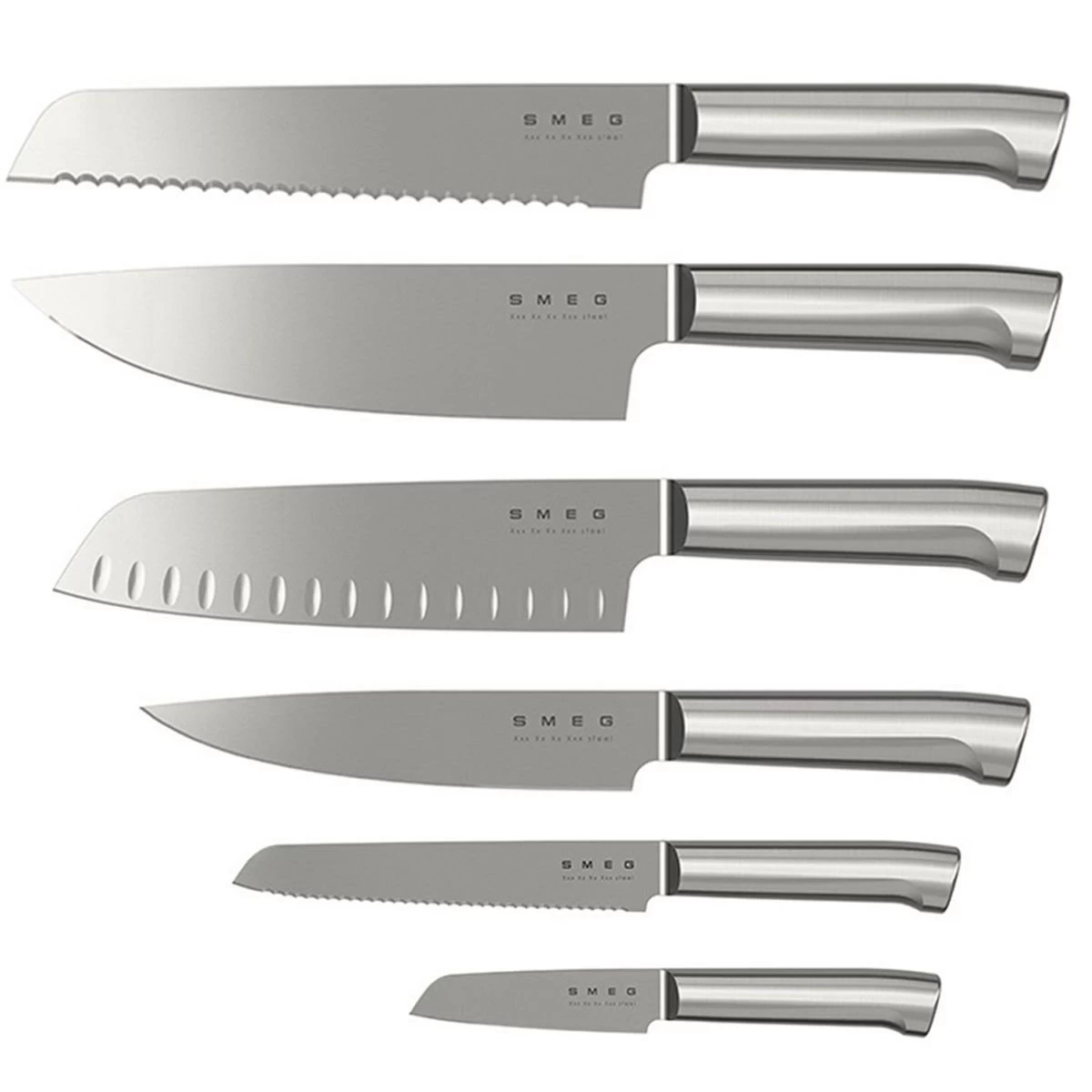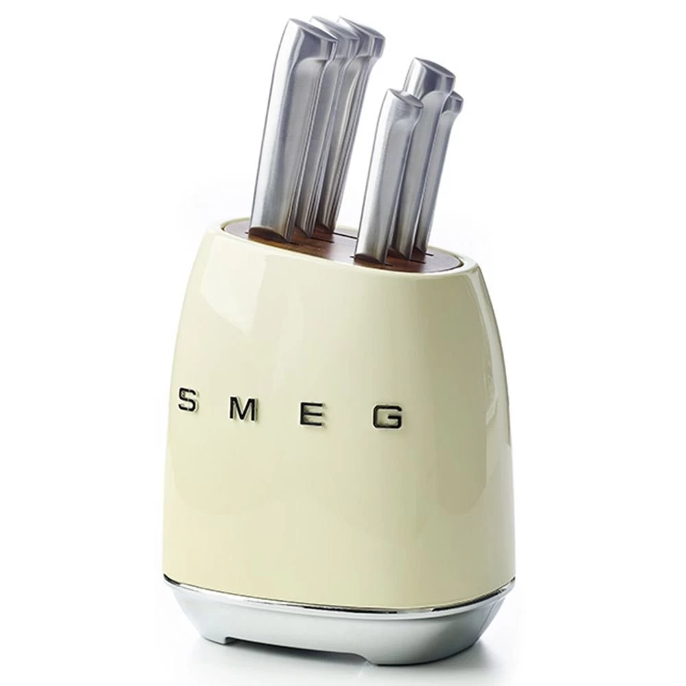 Bring classic SMEG styling and a vintage 1950s look to your countertop with this 7-Piece Knife Block Set! The acacia wood knife block has an easy-to-clean powder-coated carbon steel exterior in glossy Cream to coordinate with other SMEG countertop appliances, and the anti-slip feet keep the block from sliding around when you remove a knife. The knives in this set have quality German stainless steel blades and polished stainless steel handles so they are durable and ready for everyday slicing, chopping, and cutting tasks. The set includes a Vegetable Knife, Utility Knife, Meat Knife, Santoku Knife, Bread Knife, and Chef’s Knife.