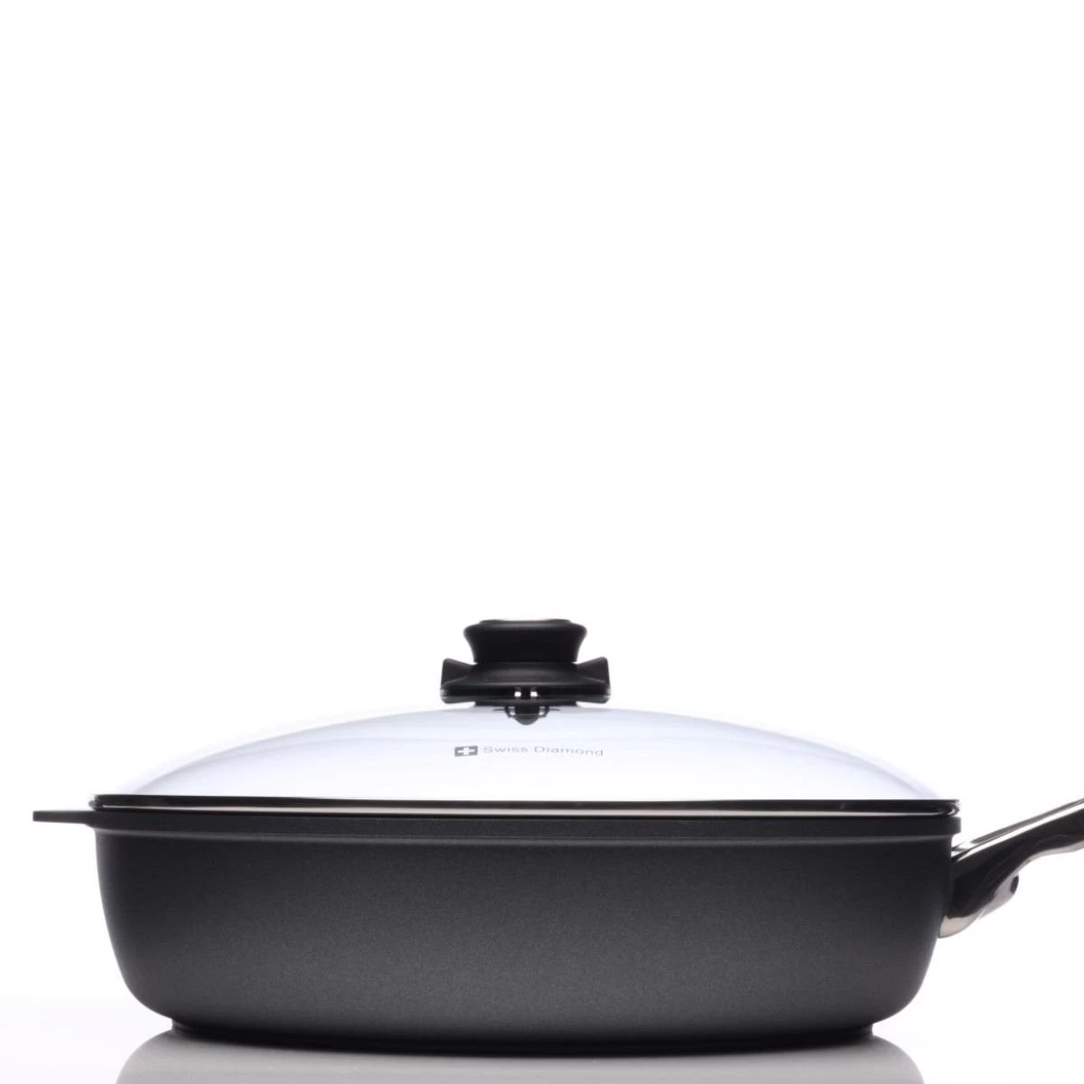 The oversized 6 Qt covered Swiss Diamond sauté pan has a 12.5” diameter with high sides and a pressure cast helping handle. This Swiss Diamond pan is excellent for sautéing, browning, searing plus deglazing. This Swiss Diamond Pan has a vented metal-rimmed heat-tempered glass cover.