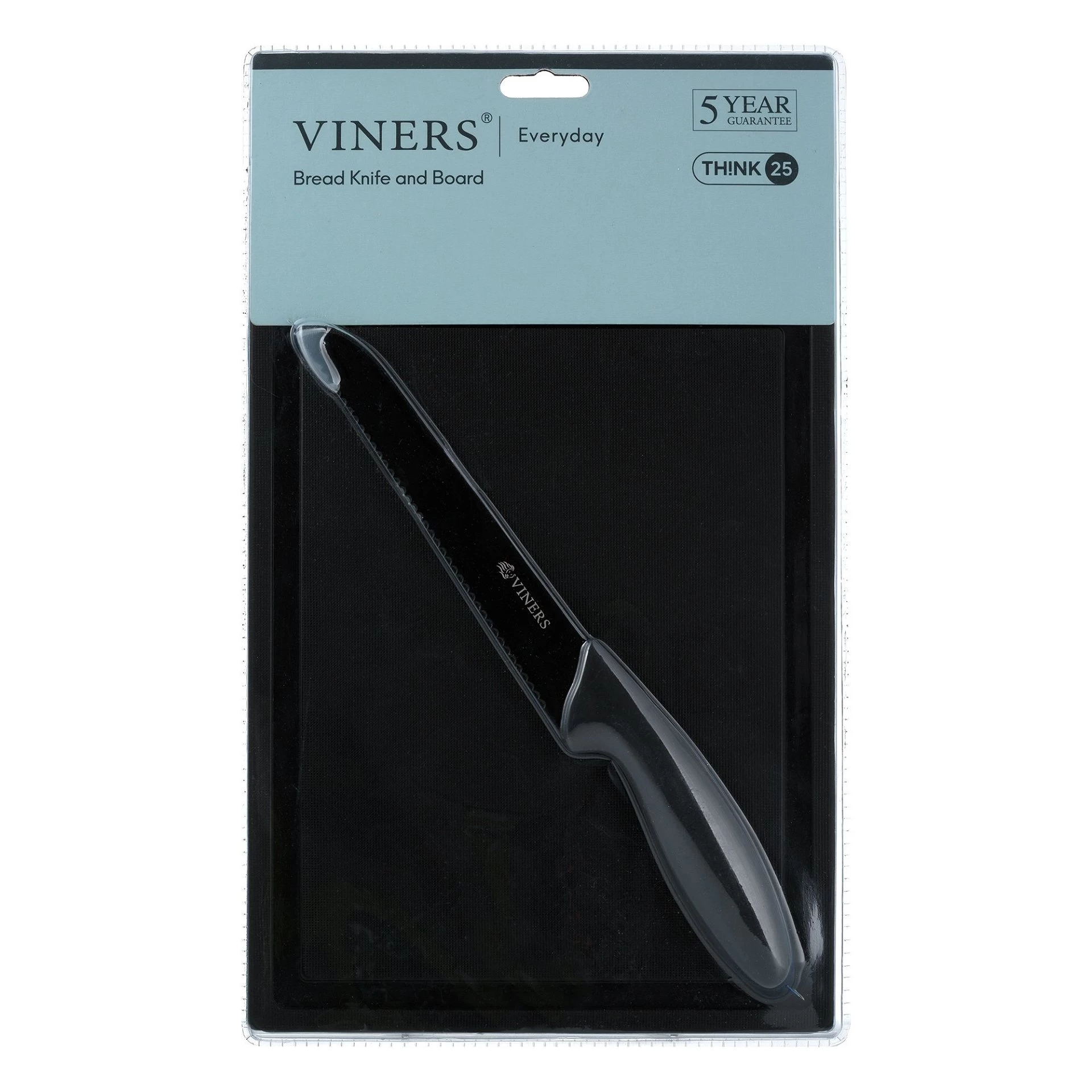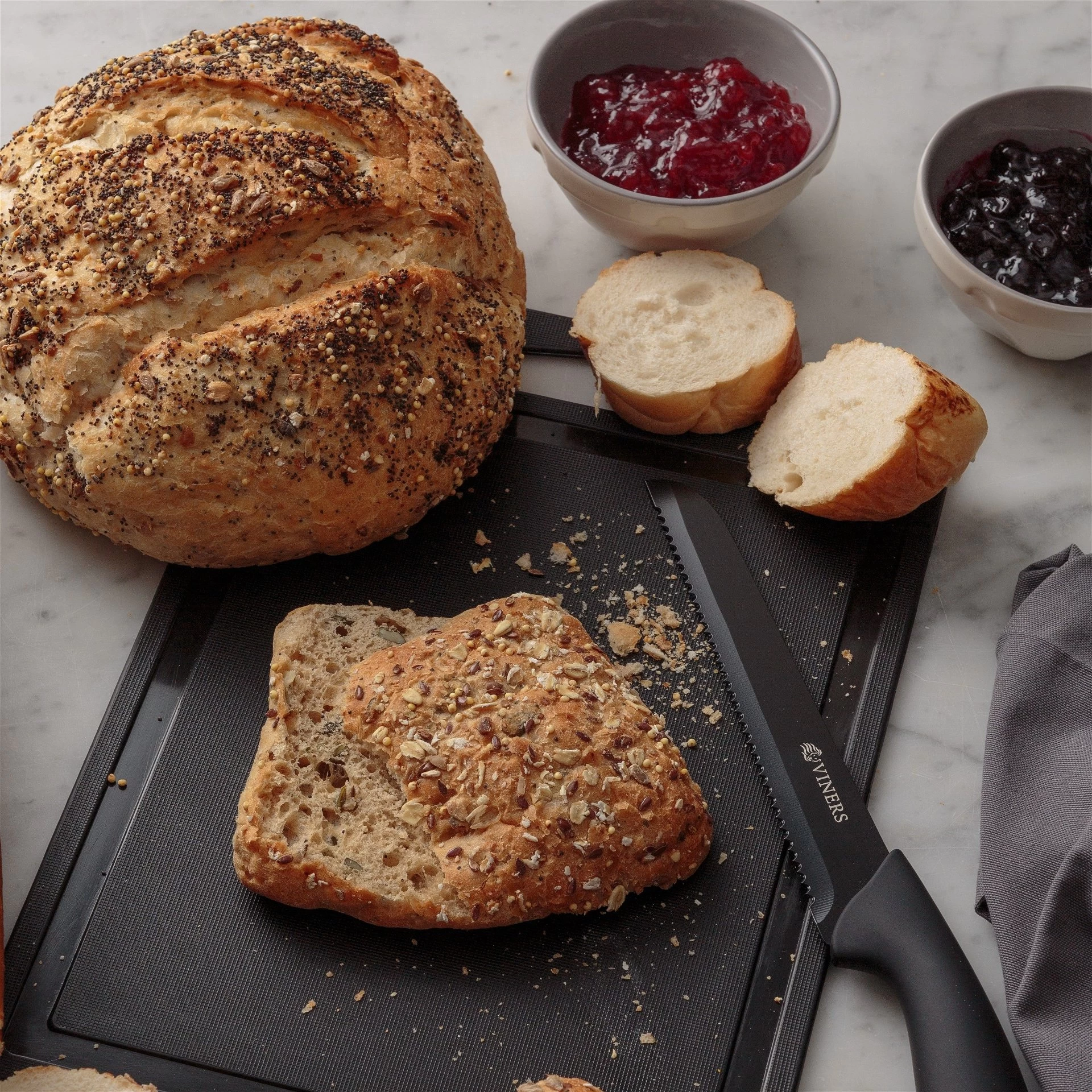 Slice a French baguette or a homemade sweet Hawaiian loaf with the Viners Everyday Bread Knife & Board! This set comes with a matte black polypropylene cutting board and a high-quality bread knife crafted with a stainless steel serrated blade that’s been finished with a sleek black nonstick coating. With a curved soft-touch handle for ultimate comfort and control, this durable knife will seamlessly cut through hard or soft baked goods without smashing them, ensuring your bread keeps its texture and shape. For a sophisticated set that’ll make a great addition to your kitchen toolset, try the Viners Everyday Bread Knife & Board Set today!