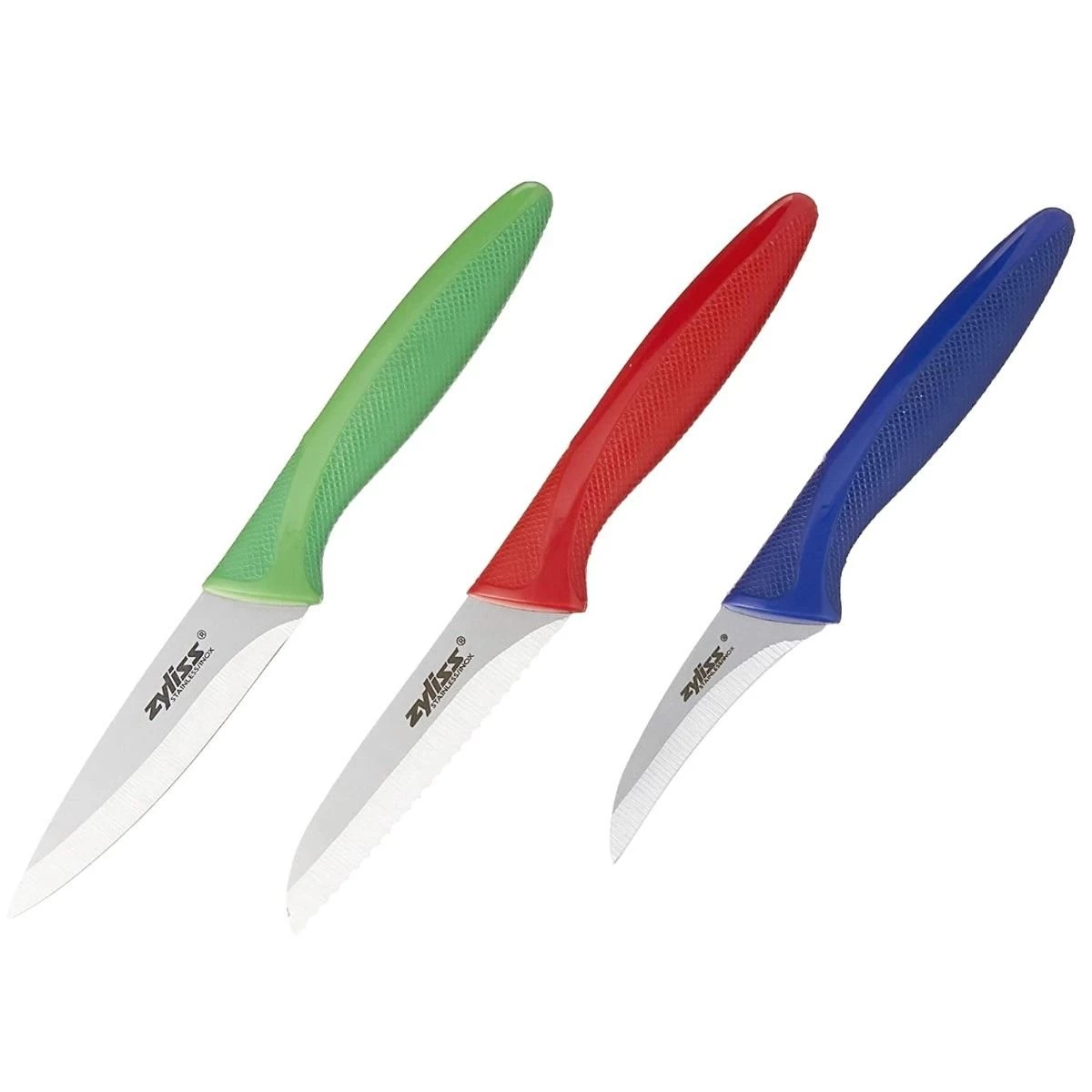 The Zyliss 3-Piece Peeling & Paring Knife Set offers a useful collection of cutlery pieces designed to accomplish specialized food prep tasks. This set of peeling and paring knives is available in corrosion-resistant stainless steel that offers extremely sharp cutting edges. Featuring soft, ergonomically designed handles, these knives provide a comfortable, non-slip grip. All knives also include plastic protective blade covers for safe storage and transport. Focusing on functionality, durability, design, cleanliness and safety, Zyliss has relied upon a heritage of excellence that began in Switzerland over sixty years ago. Building on this time-held tradition, the brand has advanced to produce and distribute kitchen equipment that is world-renowned. Zyliss has pioneered the design of more than 200 kitchen essentials, with quality and engineering that cannot be duplicated. The Zyliss Guarantee ensures that all products remain free from defects in material and workmanship for 5 years on manual appliances.